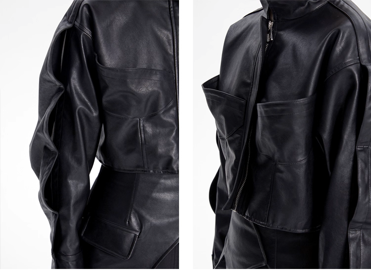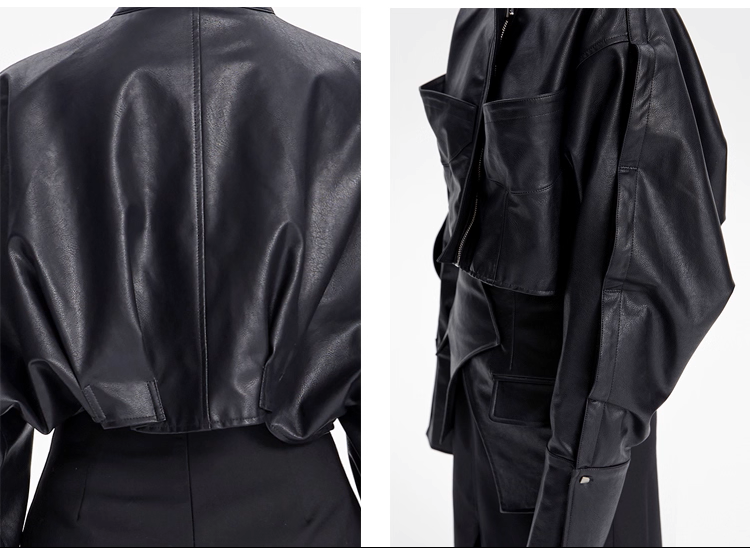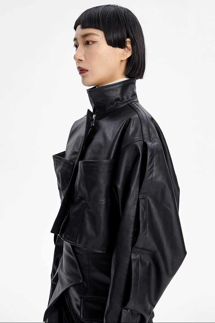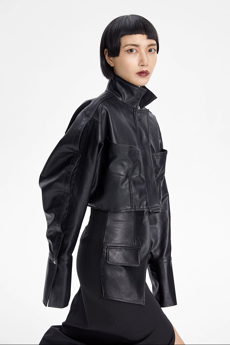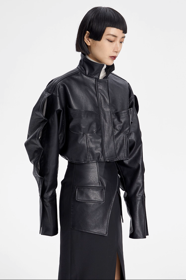 Short vegan leather jacket. Stand up collar and structured sleeves.