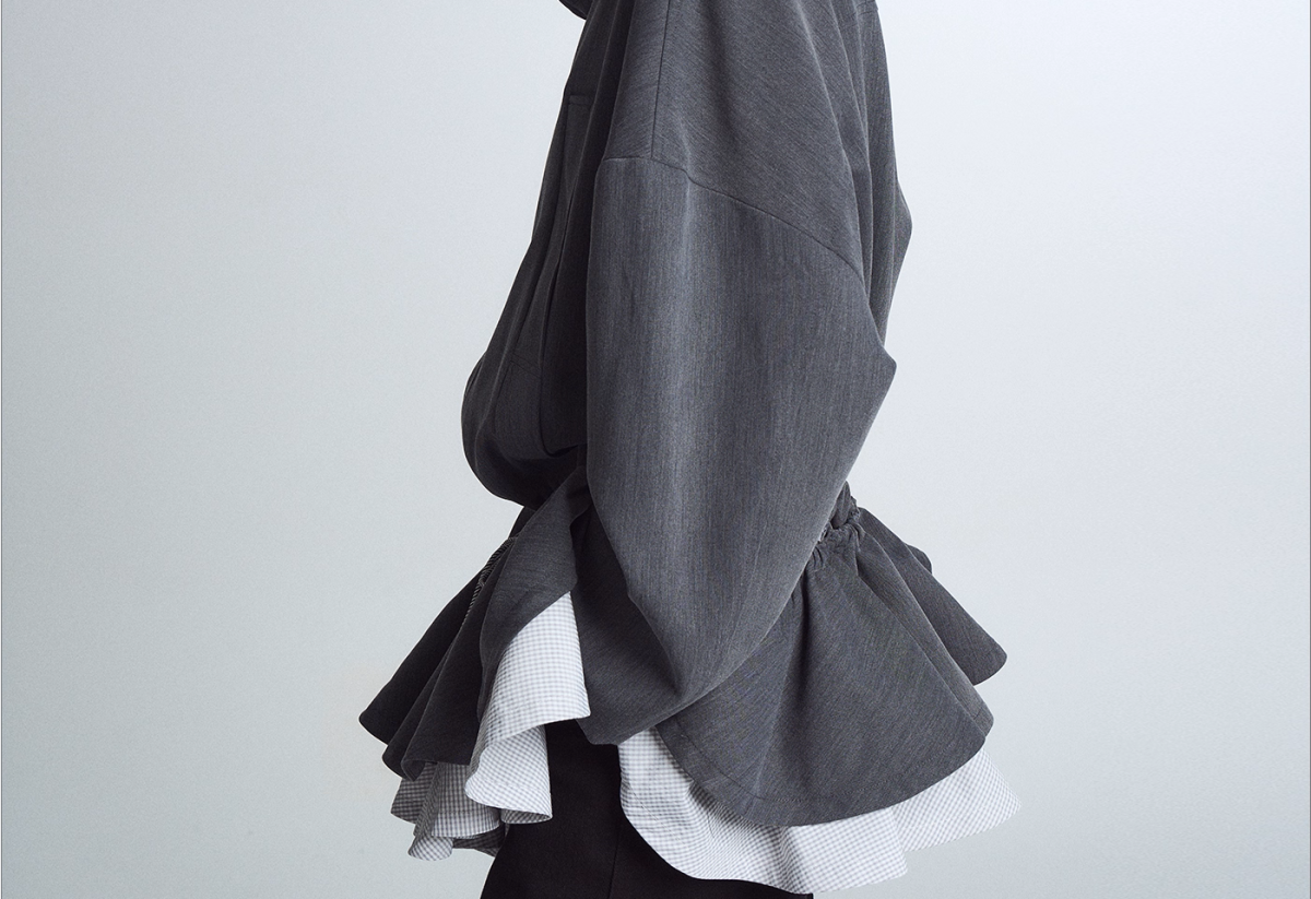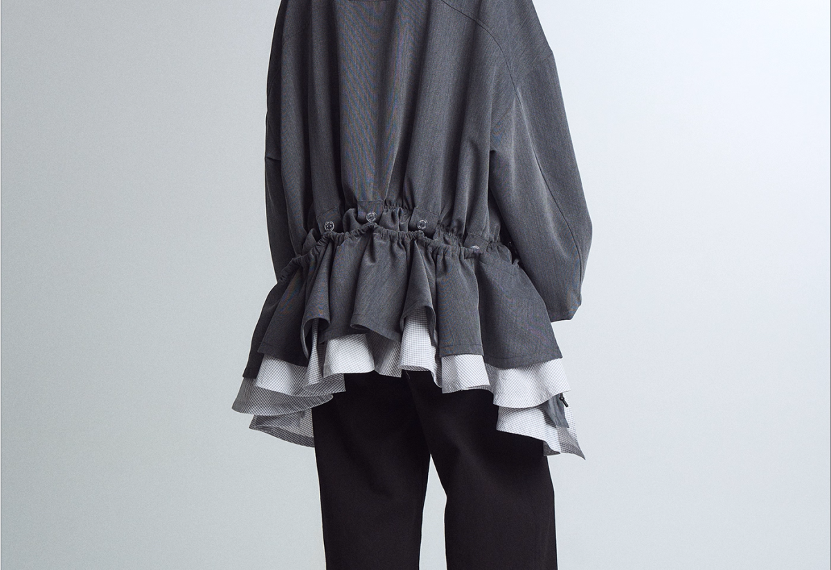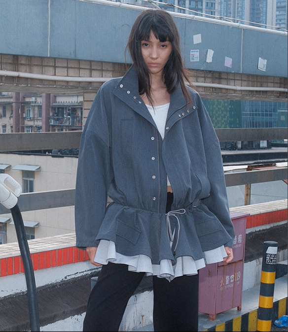 This puffy jacket features a detachable two layered skirt with stand-up collar.